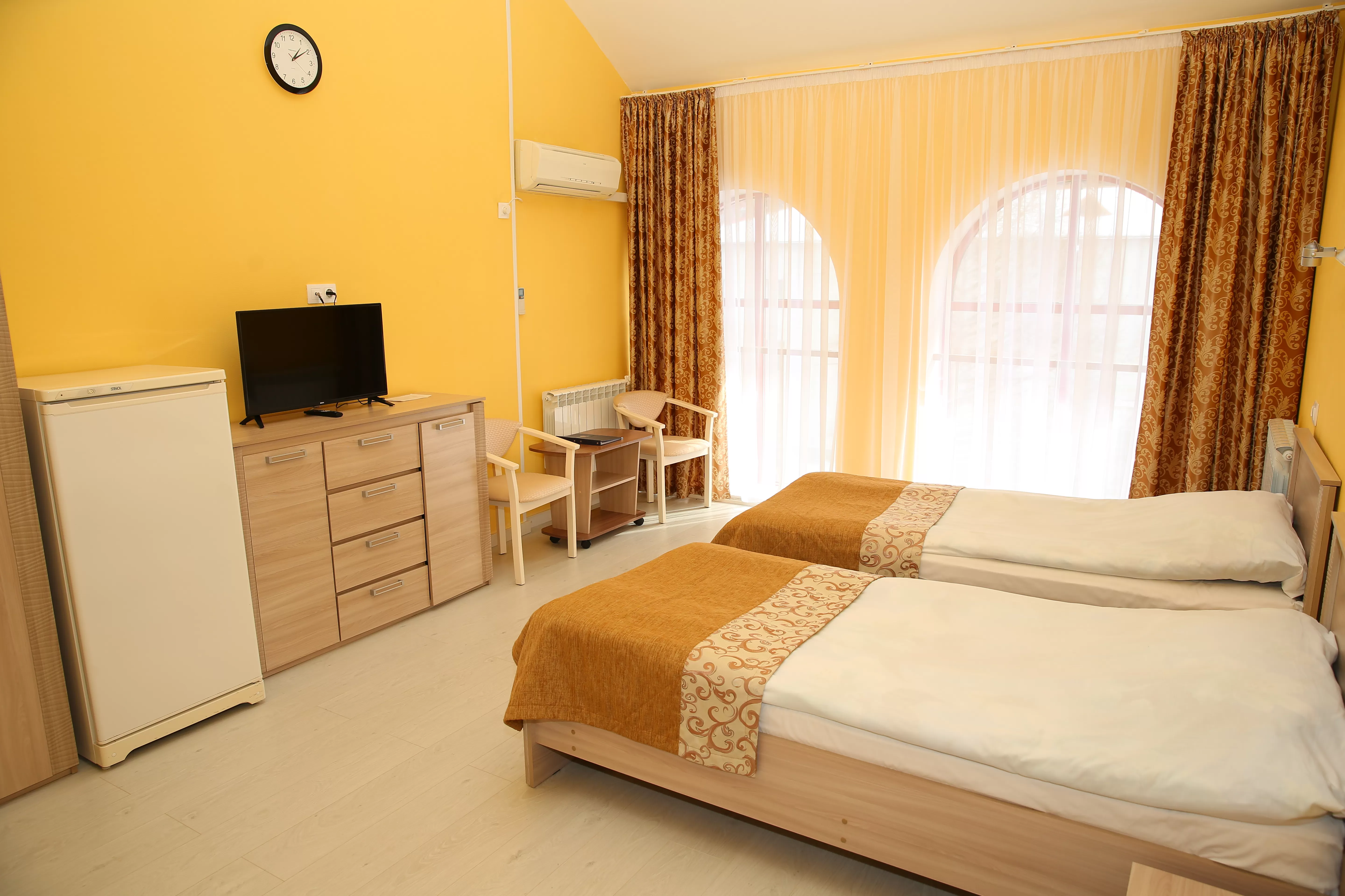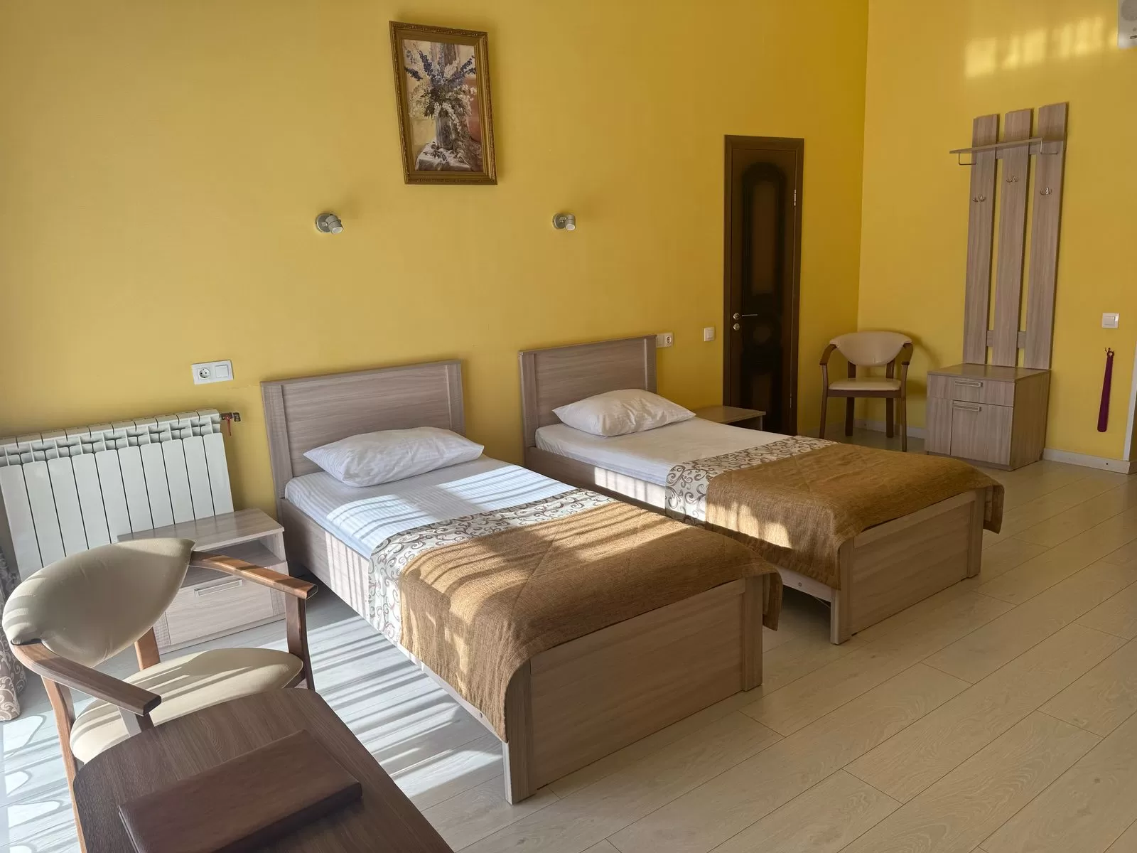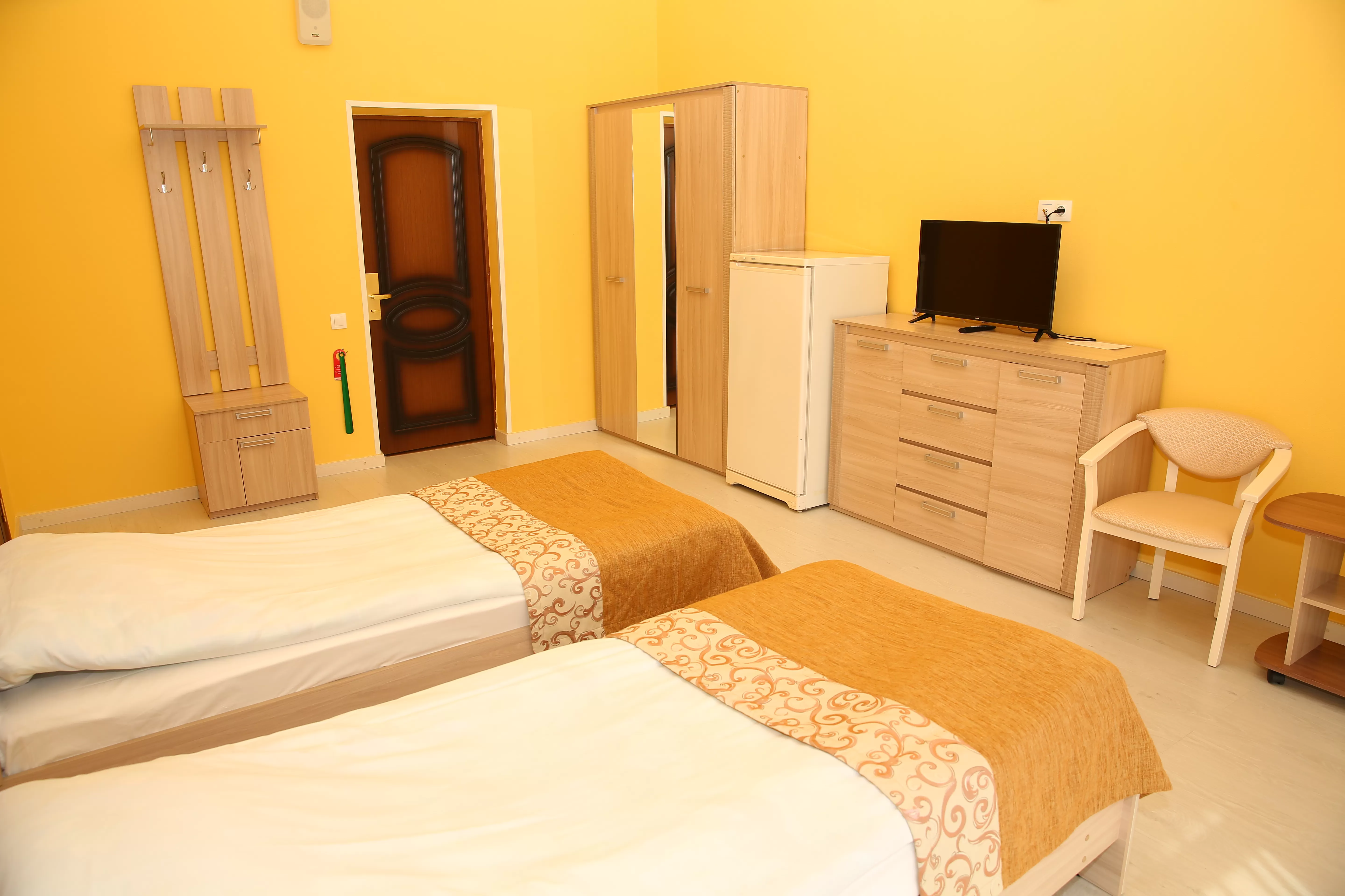 Современный номер с двумя кроватями и хорошей мебелью для комфортного проживания.